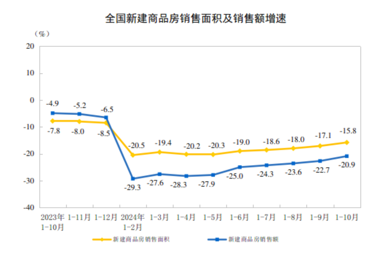1—10月份,房地产开发企业房屋施工面积720660万平方米,同比下降12.4%。其中,住宅施工面积504493万平方米,下降12.9%。房屋新开工面积61227万平方米,下降22.6%。其中,住宅新开工面积44569万平方米,下降22.7%。房屋竣工面积41995万平方米,下降23.9%。其中,住宅竣工面积30702万平方米,下降23.4%。