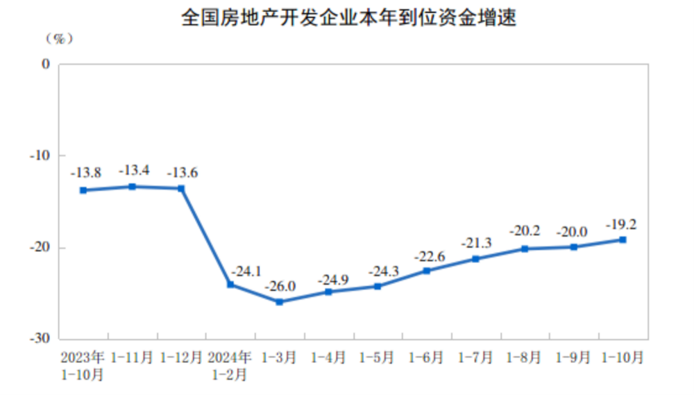 1—10月份,全国房地产开发投资86309亿元,同比下降10.3%;其中,住宅投资65644亿元,下降10.4%。