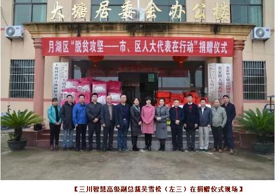 三川智慧总裁李强祖,于2016年11月当选为鹰潭市第九届人大常委会委员。此次在月湖区人大常委会组织的"脱贫攻坚--市、区人大代表在行动"捐赠仪式上,一次性以个人名义捐款人民币15,200元。米兰网页版高级副总裁吴雪松受李强祖总裁委托,出席了本次捐赠仪式。