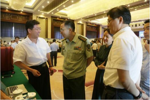 三川智慧高级副总裁吴雪松(左一)向省消防总队领导介绍三川智慧物联网产品